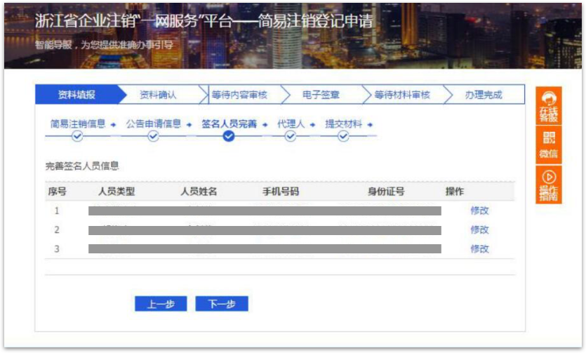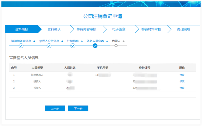7 信息录入完毕点击下一步进入【签名人员完善】界面,将签名人员信息完善后点击下一步进入【代理人】界面。