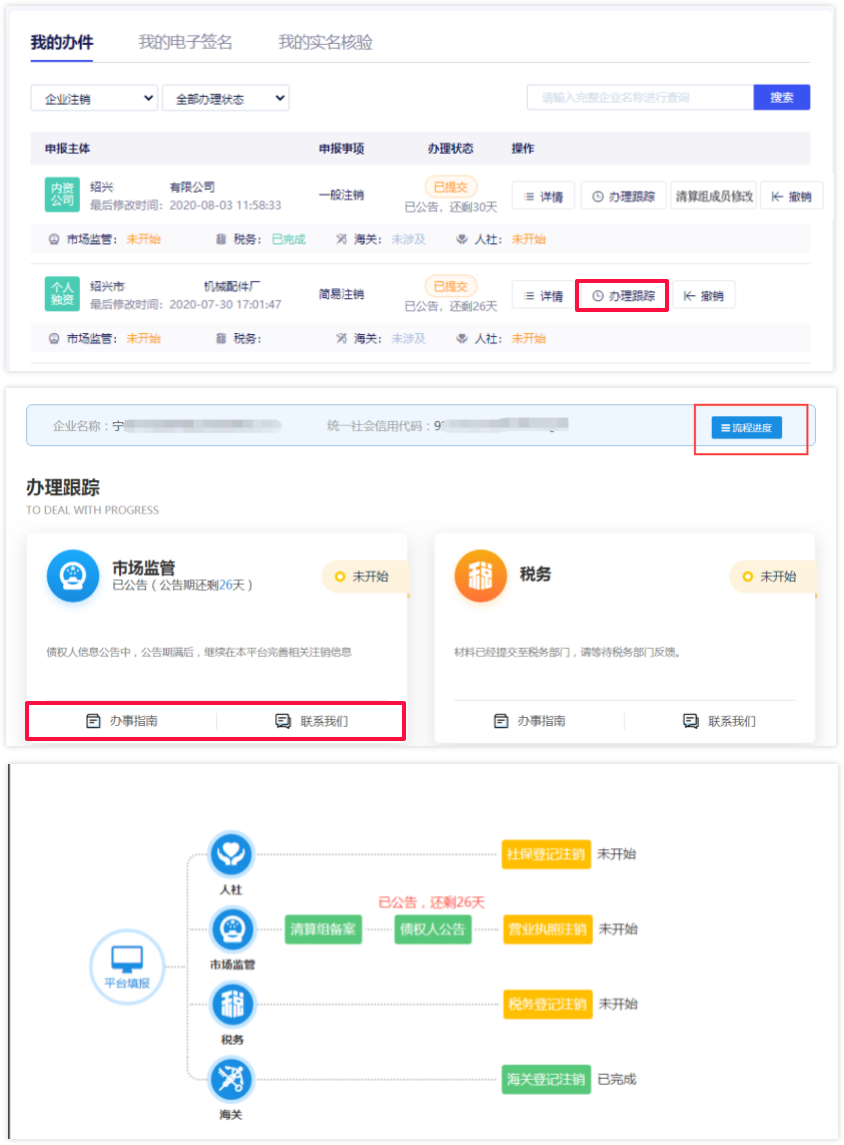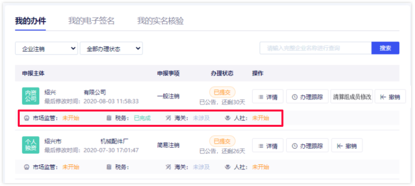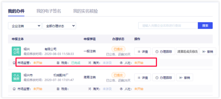 1 提交注销申请后,返回至平台首页,在我的办件中,标记字体颜色也会随着办理状态变化而改变,其中黄色代表未开始,绿色代表已完成,灰色代表不涉及该部门业务。