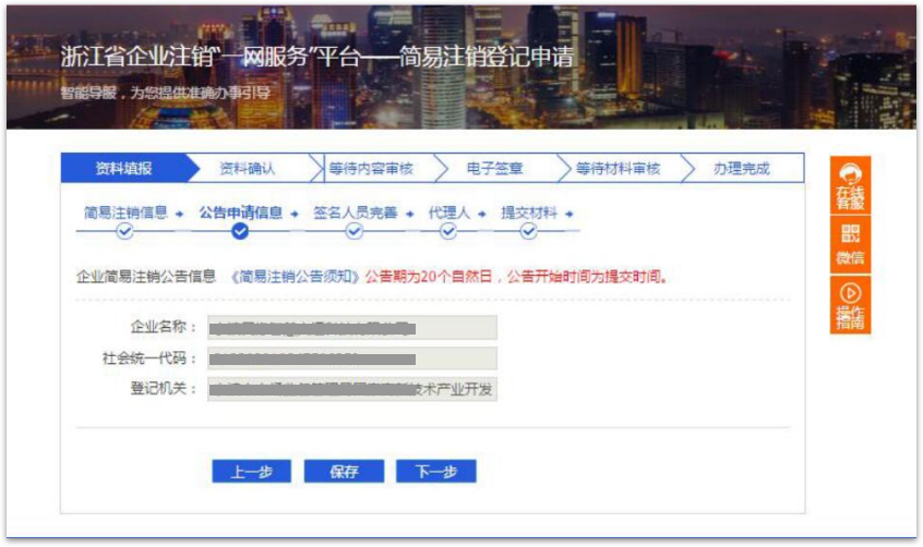 10 信息录入完毕后点击下一步进入确认信息页面,确认信息无误后点击提交。 全部注销信息填报完成后,系统提示企业申请信息将同步推送至各相关部门,后续可在平台查看办理进度。