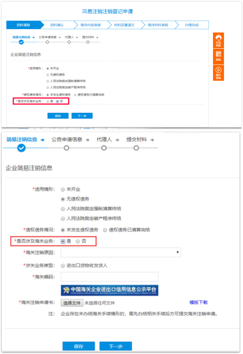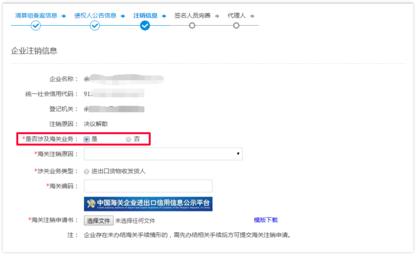 6 信息录入完毕后点击下一步进入【注销信息】界面,是否涉及海关业务系统会自动匹配,填写好之后,数据会推送至海关,海关会进行审核,审核之后将结果反馈至该平台。