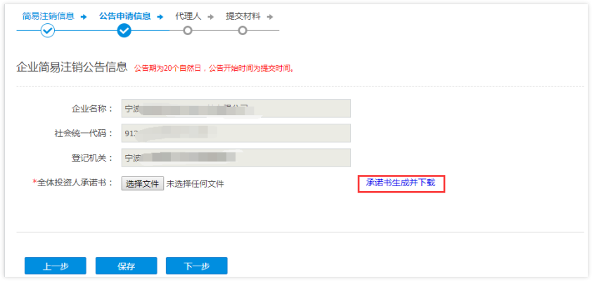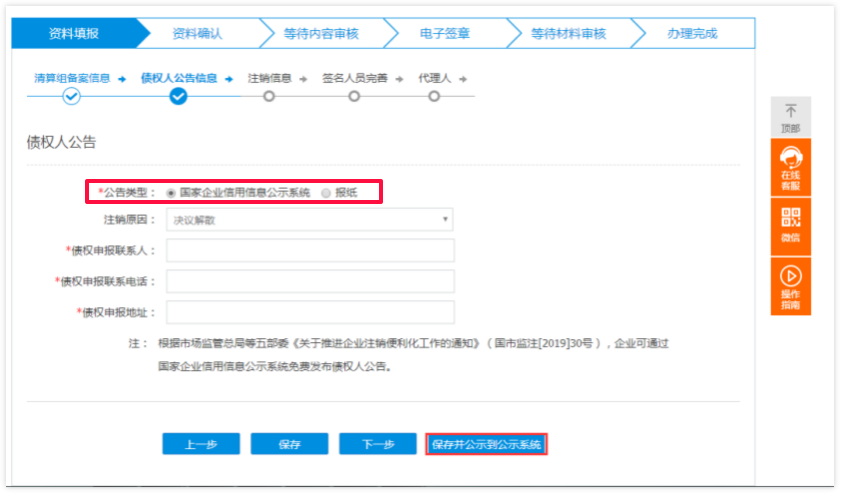 5 信息录入完成后点击下一步进入【债权人公告信息】页面,该页面申请人可以选择公告类型方式,可选择通过国家企业信用信息公示系统,或选择通过报纸刊登债权人公告。