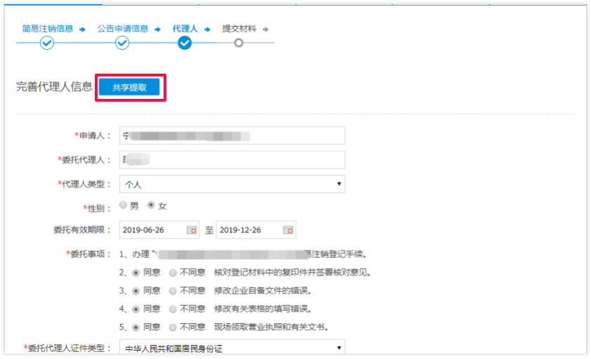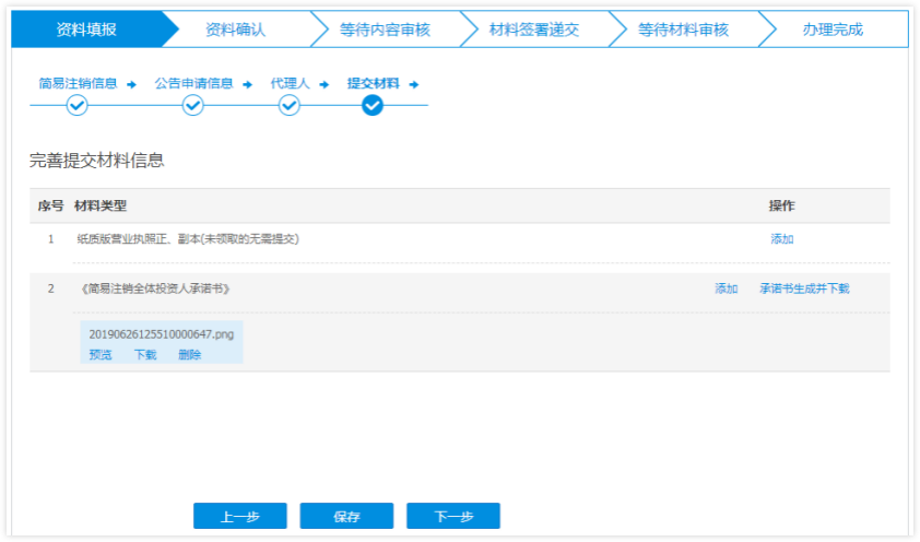 9 代理人信息填写完成之后,点击下一步进入【提交材料】页面,标*为必传项,不标*可不进行上传。