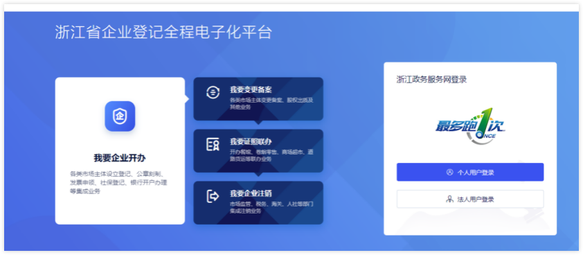 1 使用个人账号或法人账号,登入浙江省企业登记全程电子化平台,选择【我要企业注销】进入注销申报页面。