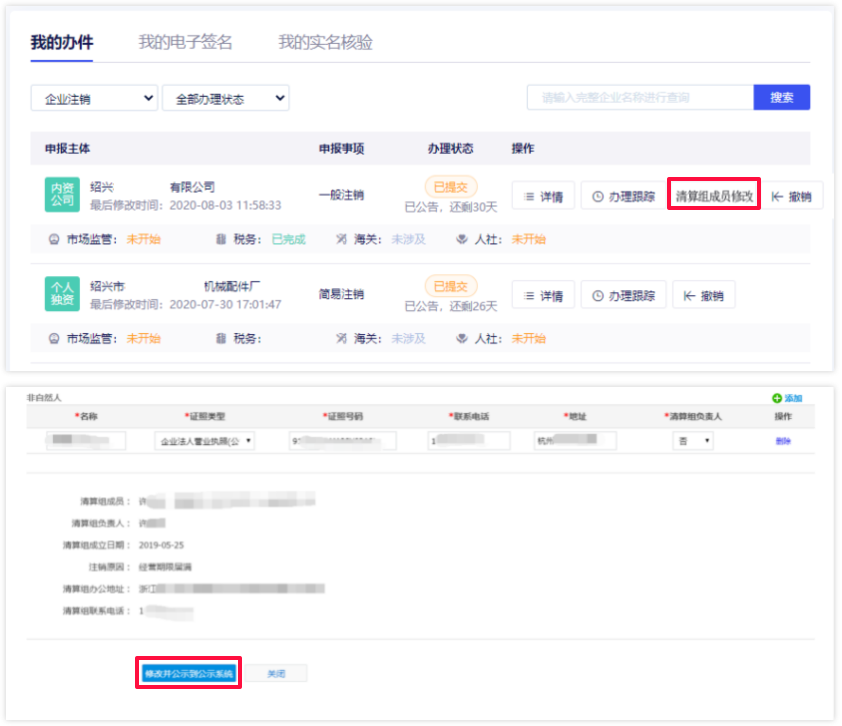 2 在我的办件中,还提供清算组成员信息修改功能,针对已经公示到国家企业信息公示系统的企业,在公示期间,若需要修改清算组成员信息,可以在我的办件中修改清算组成员信息,修改后的信息会再次同步公示到国家企业信用信息公示系统。