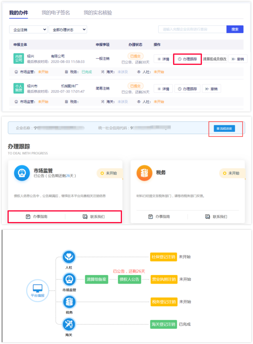 3 点击办理跟踪,可以查看各部门业务办理状态,办事指南以及具体联系方式,点击办理跟踪,可以查看各部门业务办理状态,办事指南以及具体联系方式,点击流程进度可以查看业务具体进程。