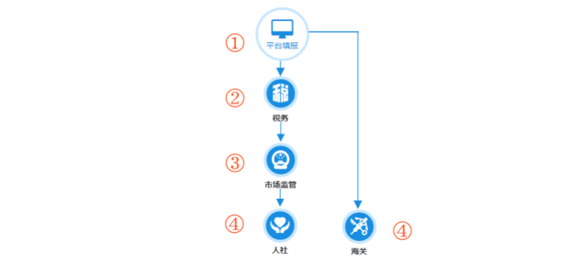 ! 各部门注销关系如下图:平台填报之后审核流程为税务→市场监管→人社、海关(非涉及不包含此项)