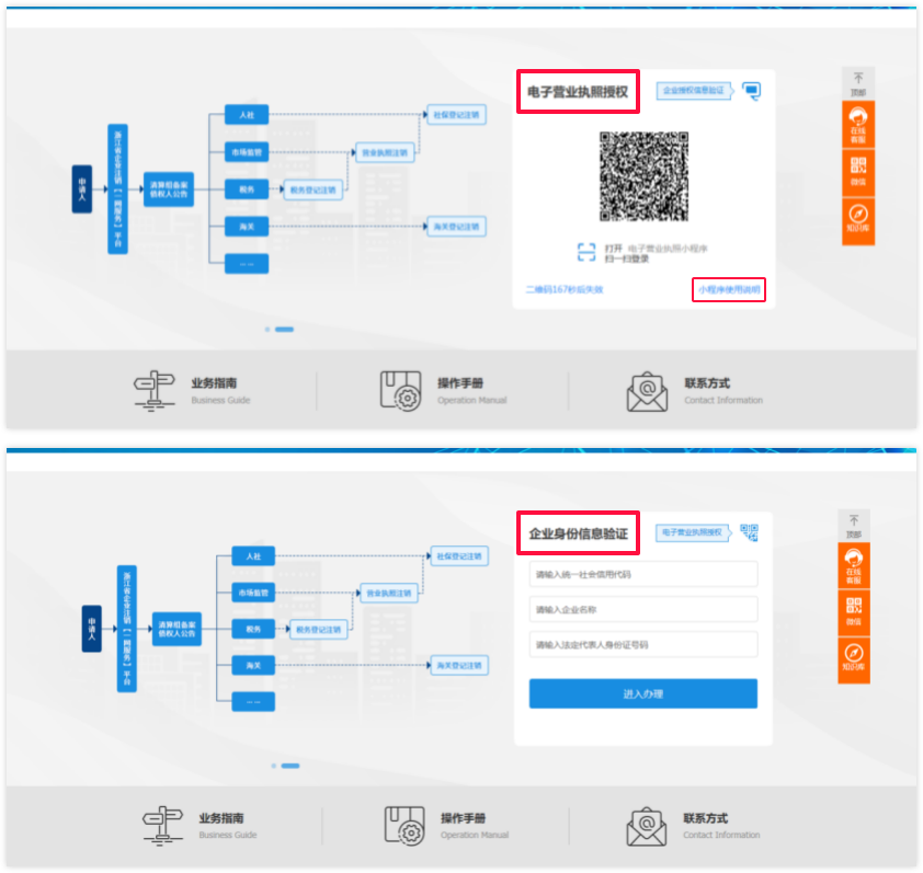 ! 【电子营业执照授权】 申请人使用手机电子营业执照小程序,扫码登录。同时平台也提供了具体小程序使用说明。 【企业身份信息验证】 企业身份信息验证登录是在该页面录入企业统一社会信用代码与法定代表人的身份证件号进行确认登录。