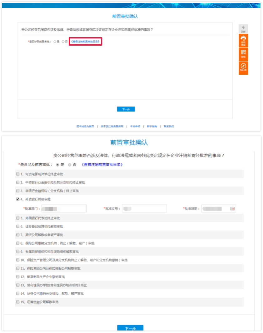 3 申报页面进入后出现“前置审批确认”页面,请根据单位的自身情况进行选择,也可以通过点击《查看注销前置审批目录》查看具体项目名称与实施部门。