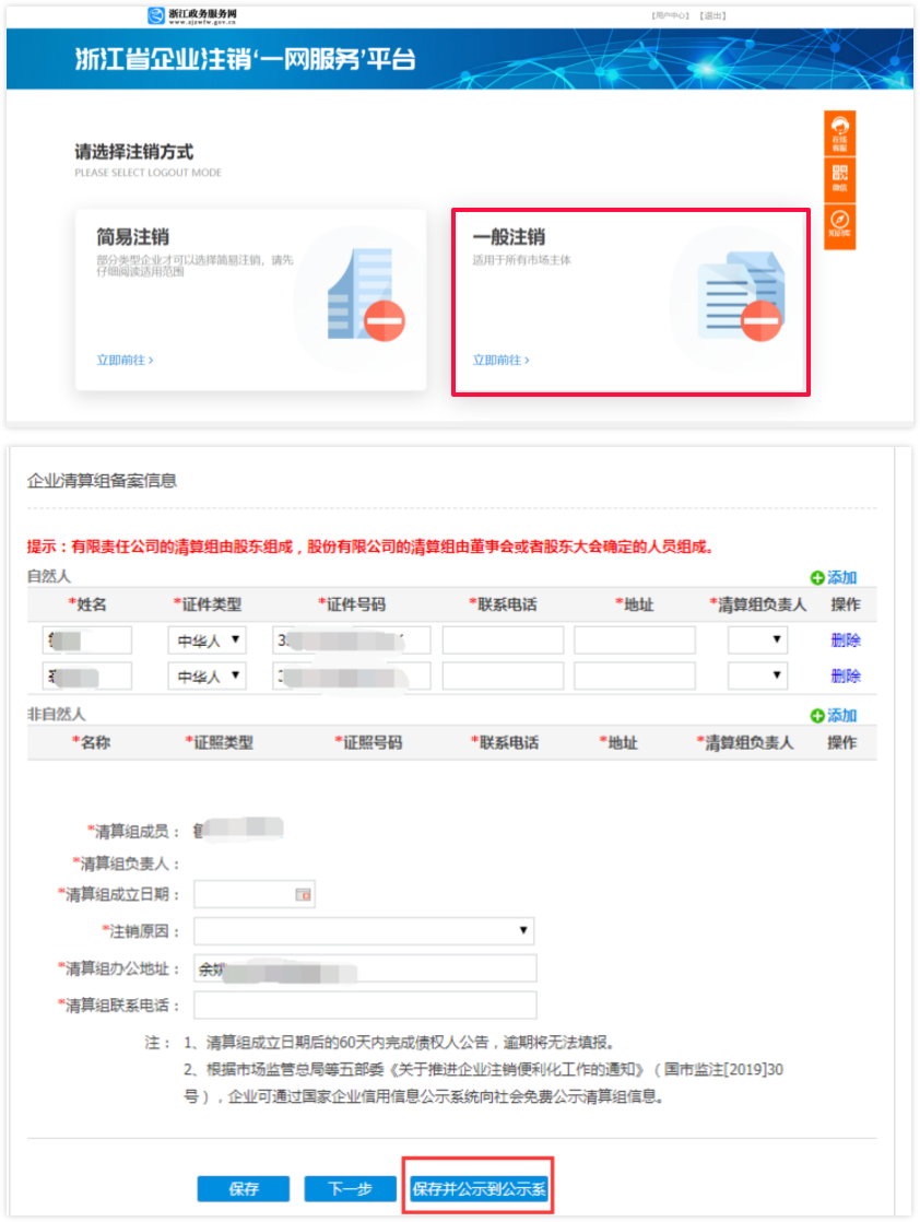 ! 清算组备案信息填写完成后,点击保存对接国家企业信用信息公示系统,企业可在弹出页面,填写清算组成员信息,点击保存并公示到公示系统,系统将在公示系统进行清算组备案的公示。